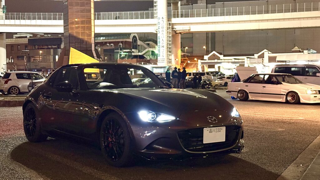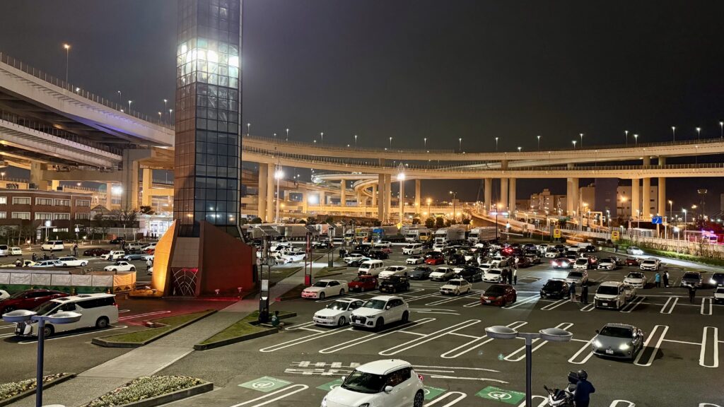 C1からレインボーブリッジ、湾岸線を経由して大黒パーキングへ。短距離ではありますが満足のドライブでした。それにしても、月曜日の深夜24時になのにカスタムされたスポーツカーが多い。写真手前は空いていますが、奥側はほぼ埋まるくらいでした。