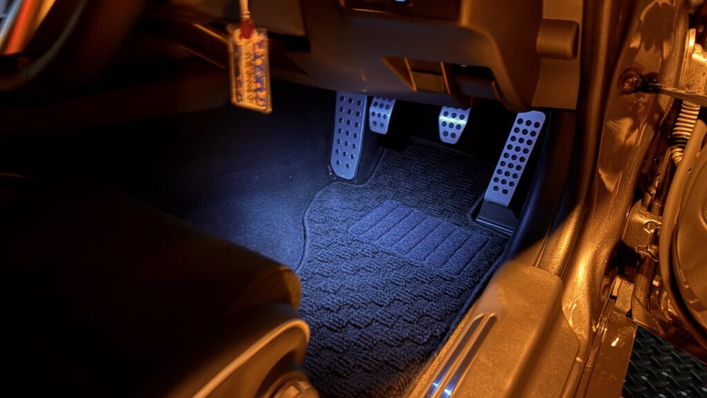 写真では青っぽく見えますが普通に白いです。フワッと足元を照らしてくれて、ちょっとだけ高級感。走りには関係無いですが、こういったところの所有感を満足させてくれるものは好きです。